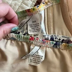 Two piece swimsuit from J. Crew. Top is size 34A and bottoms are size small. Swimsuit is cream colored with a floral/botanical design. Top has underwire structure. Comes with extra straps.