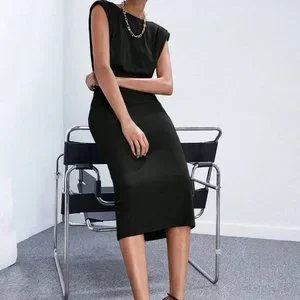 Black Preppy Womens Solid Shoulder Pad Ruched Waist Dress