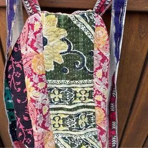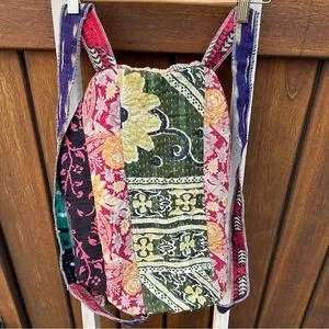 ✨Unique, vintage handcrafted drawstring satchel backpack bags from India. Recycled saris are hand stitched in traditional kantha quilting. One of a kind vibrant patterns