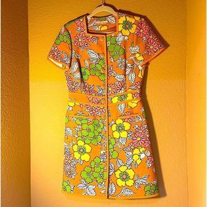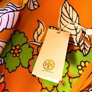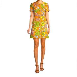 Evoke a sense of nostalgia with this orange floral minidress from Tory Burch. Made from heavyweight twill to create a structured fit, it's designed with a square neck, slip pockets and an A-line skirt. Style yours with platform sandals for a directional retro look. This tailored mini dress with a flared skirt, button closure, and graphic floral stencil motif is a wonderful statement piece for many occasions from a baby or bridal shower to Mother’s Day brunch to vacation wandering… thus is an amazing dress.