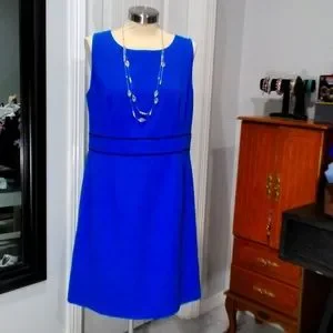 Kasper women's crew neck sleeveless contrast inset waist. blue with a black trim on the waist .nwot excellent condition. In size 12