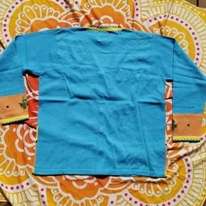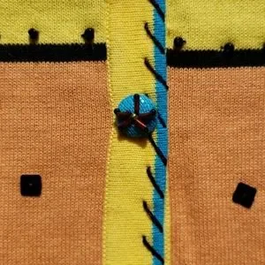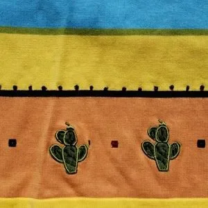 This lighter-weight Hot Tamale sweater features beaded and embroidered chilies, peppers and cacti, among beautiful oranges, yellows, and turquoise.