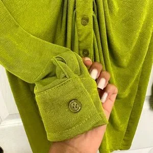 A long-sleeve ruched green dress great for the summer in transition to fall. This ensemble can work with many versatile looks. Dress up or down in this vibrant bright green chic dress.
