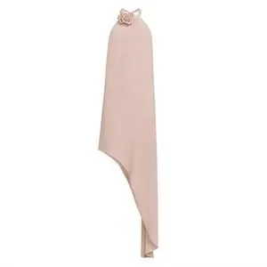 Cut for a slightly relaxed fit, this crepe silhouette cascades from a halter neckline embellishment with a charming georgette rose to an elegant, asymmetrical drape panel. It has a back V, concealed center back zipper & adjustable back neck tie.