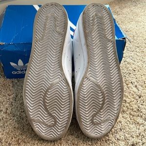 Gently worn pair of Adidas superstar shoes, lots of life left in these! White with red “superstan” on back for Stan Smith. This is a classic pair of shoes to add to your superstar collection! Original box included.