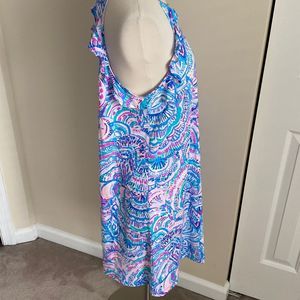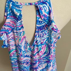 Excellent preowned condition. No rips or stains. Vibrant colors. A-line style. Ruffles along bust. Cut out detail at back. 100% pima cotton.