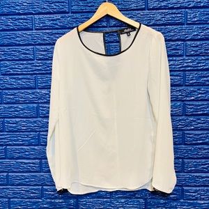 White sheer blouse with keyhole in the back and black faux leather lining. EUC with small scuff on the front thar is very unnoticeable. I tried to photograph it but it is very hard to see. All measurements taken flat. Size medium measures shoulder to hem 26”, armpit to armpit 19”. C151