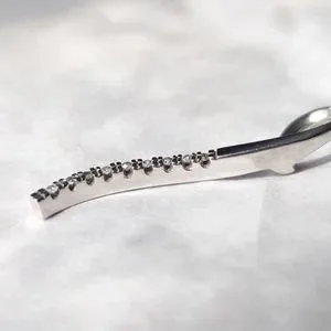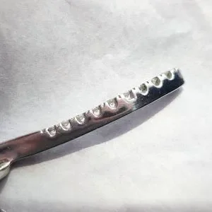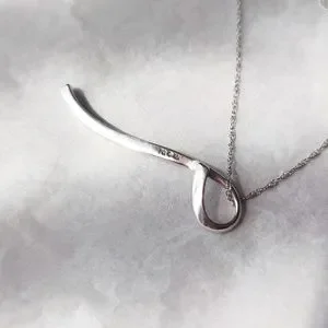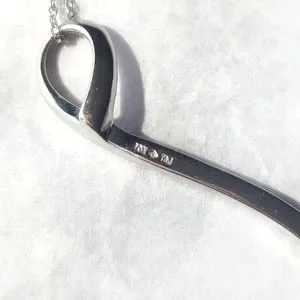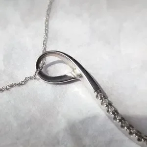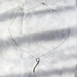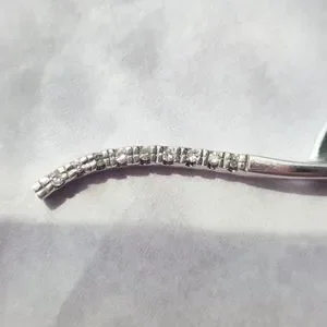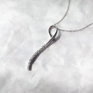 Gracefully curved solid 10k white gold pendant set with 9 tiny lab diamonds made by Taj Jewelers on a solid 14k white gold Singapore chain (the chain is not from Taj).