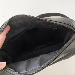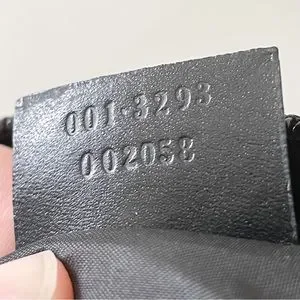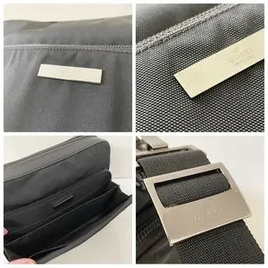 Fabric strap, silver hardware and silver logo plaque. Some small scratches on the front plaque