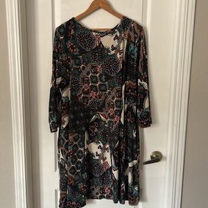 This polyester dress/tunic WITH POCKETS falls above the knee and looks great on its own or with pants/jeans. Long sleeves. Classic pattern. Like new.