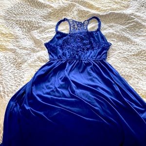 Gorgeous simple sun dress with high low hem. The blue is a bright Klein blue Or Royal Blue, almost indigo. The material is a comfy T-shirt jersey farcical with lots of stretch: can fit L and XL bodies too! The crochet back adds a bit of drama and flair. Great for women with neutral and cool undertones.