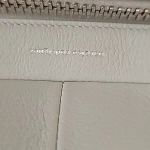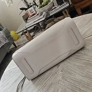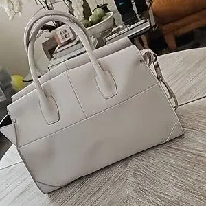 Beautiful leather. Leather lining. Three interior pockets. Looks New. Make-up bag added by me. There's a small item pictured that was attached to the interior that came off....repairable but doesn't seem to impair any function. Generic dust bag. The color is a very light grey.