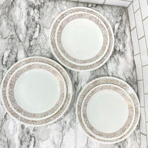 Corelle Set of 6, 3 Dinner Plates and 3 Lunch Plates in the Woodland Brown pattern. Good vintage condition with wear from use with scratches in paint, and some black marks, see pictures.