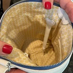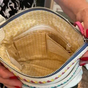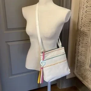 Worn only once! Brighton White Montego Messenger Bag (crossbody) with multi-colored tassel and stitching (looks slightly off-white colored instead of stark white). Measures 10" x 10" with an adiustable shoulder strap. One side has three outer pockets with one having a magnetic closure. Interior has two slip pockets and one zippered pocket, and key strap. Top closure is a ziptop. No scratches on hardware. Comes with dust bag. Smoke free/pet free home.