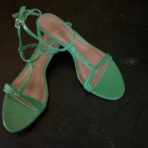 Talbots Green patent leather scrappy sandals with slight wooden wedge.
