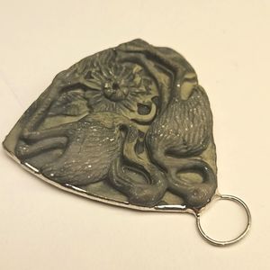 Carved natural stone, ribbon jasper pendant with 2 flamingos and a flower. I hand soldered the bezel to make this beautifully carved stone into a wearable pendant. The solder is jewelry safe solder and can be worn on whatever chain or necklace you see fit. The pendent does not come with a chain.
