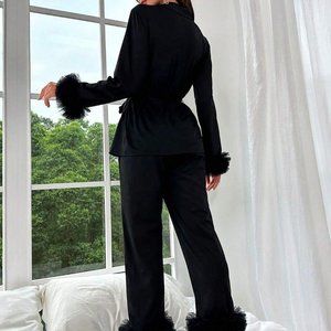 Black Preppy Womens Fuzzy Trim Belted PJ Set