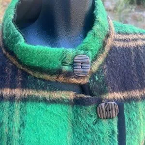 Z. Z. Classic Fashion short and/or cropped, plaid furry jacket. Retro style with chunky buttons up the front and at the nape. Two side pockets, fully lined with some nice detailing and a cut out at neck.