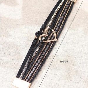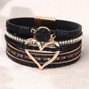 6 strand faux leather bracelet with magnetic clasp. Embellished with rhinestones, gold tone heart and black druzy stone.