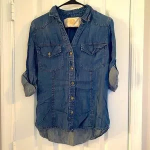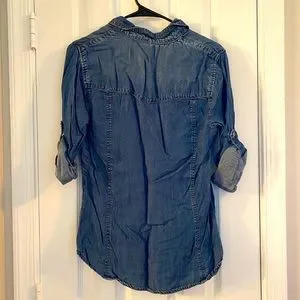 Bella Dahl button-down, double-breast pocket chambray/denim shirt in excellent condition. Sleeves can be worn long or 3/4 rolled up buttoned. Worn less than a dozen times. Shirt has wrinkles due to being in storage.