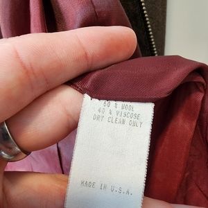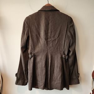 Flat front brown blazer in a wool/viscose blend. Vertical slit side pockets with adjustable waist belts and button strap cuffs. Full zip to the collar with button loop.
