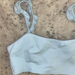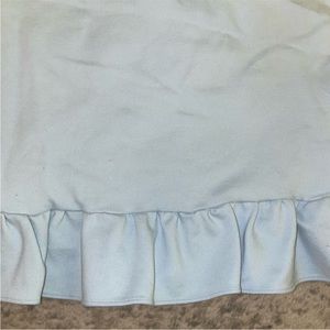 2 Piece Baby blue midi skirt and crop top set. Crop top has ruffle straps that are adjustable. zipper back. The skirt is high waisted and has a ruffle detail on the bottom, Also Zipper back. Soft and stretchy material. Very cute for Brunches and day events. Love the color for spring and summer. Goes cute with white sneakers or cute heels.