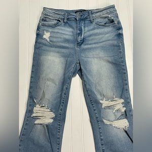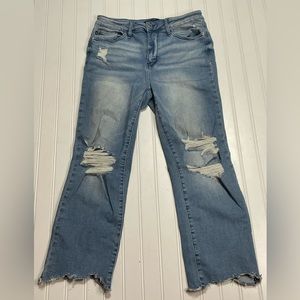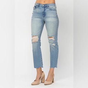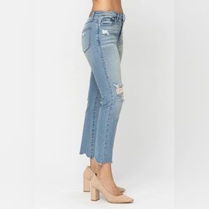 This pair of trendy Judy Blue distressed raw-hem mid-rise cropped jeans is a must-have in your closet. These straight cropped jeans will be sure to keep you comfortable all day long with their moderate stretch. In a cropped length, they're perfect for showing off your favorite sandals or heels, but can easily be worn with boots too!