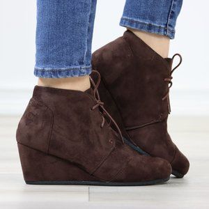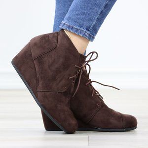 Brown Ankle Boots Wedge Heel Faux Suede Round Toe Lace Up