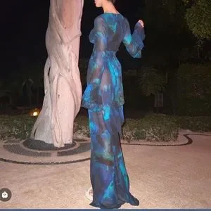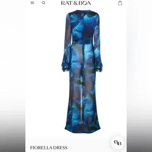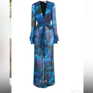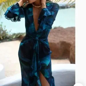 Nostalgic edge meets Latin flair in this knockout style. In this season's abstract blue floral, with a deep V neck, button front and figure-skimming cut, she's made for impact. Extreme frill cuffs add a feminine note.