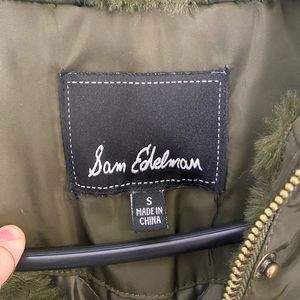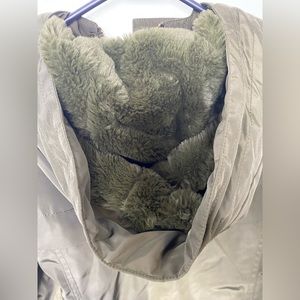 Faux fur hood feels and looks like new. Gorgeous olive color.