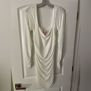 WHITE LONG SLEEVE SQUARE NECK RUCHED MINI DRESS UK 14 / US 10