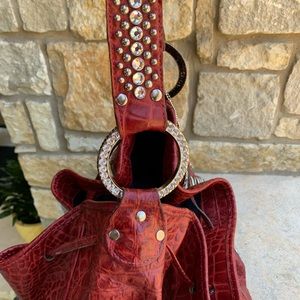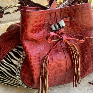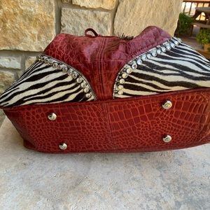 Spacious drawstring handbag made with Dark Red croc-embossed & black n white striped hair on hide leather. The shoulder strap and front of the handbag are embellished with clear Swarovski crystals. There are two crystal Swarovski O-rings that attach the shoulder strap to the body of the handbag. There is a beautiful Swarovski crystal ornament on the shoulder strap emblem. Also a pull tab as well as two small tassels. Inside the handbag, there is an interior zipper pocket. Handbag is 12”x18”.