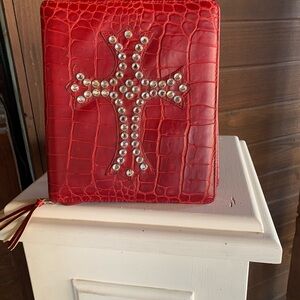 5”x7”. Included is also a leather embossed portfolio 9x8 for notepad, credit cards, coin slot, etc. Cross Swarovski Crystals.