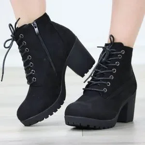Black Suede Ankle Chunky Block Lug High Heel Boots Lace-Up