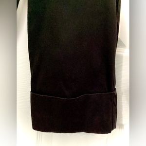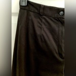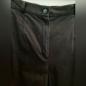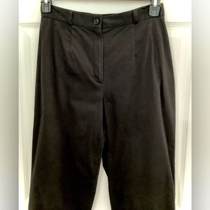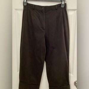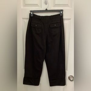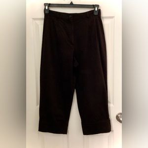 These capri pants are classy in style and very comfortable. They have 1” belt loops with a button and zipper at the waist, there is also pleated seams from the waist down a little ways, where the zipper front is there is a tiny white spot on it. On the bottom of the capris there is 4” cuffs for style. On the back of the capris have two pockets with button down flaps. The fabric is made from 97% Cotton fabric and 3% Spandex. Dry Clean Only!