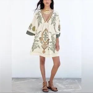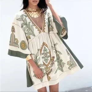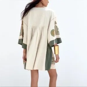 A Stunning and Well Made mini dress in a wonderful array of creams and sage neutrals. Mini dress made of cotton and linen blend fabric. V-neckline and below the elbow length sleeves. Contrast embroidery detail.