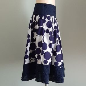 Gently preowned in good condition. A line navy blue polkadots with embroidery and sequins. Outer lightweight cotton with lining. Waist 13.5" Length 24" Mannequin size: bust 35” waist 25” hips 35”, shoulder width 16”. please look at the photos on mannequin as reference.