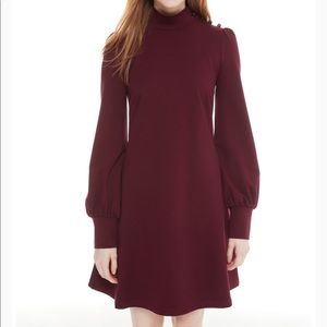A simple, yet ultra chic ponte dress with a mock neckline, hidden side pockets, and shoulder button closure offer a refined, elegant style.- Mock neck - Long bishop sleeves - Shoulder button closure - Solid colorway - 2 side hidden pockets - Unlined - Approx. 33" length (size S) - Color: deep cherry