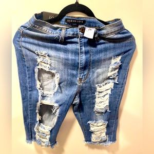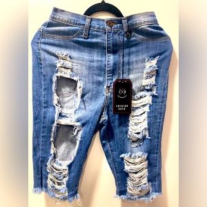 Cute distressed light blue denim shorts. Perfect for summer time vibes. Dress up or down with sneakers, sandals or wedges. Pair these with a tank, crop, bralette, and/or kimono. If you’re on the fence, just get them, you will love them and get compliments. Wink. New/never worn.