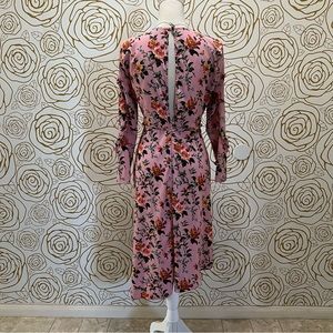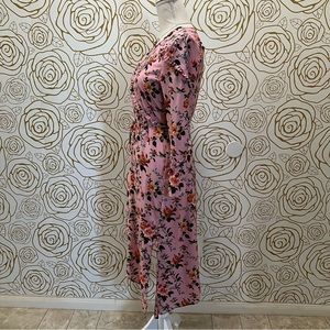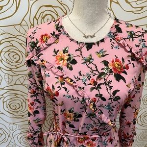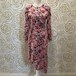 Midi dress comes in a bold pink floral pattern, featuring long sleeves, an asymmetric hem and ruffle trim details. With tie at the waist.
