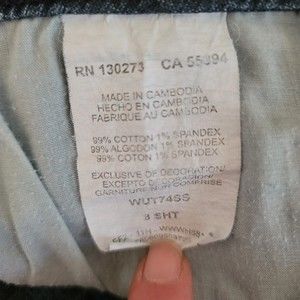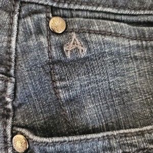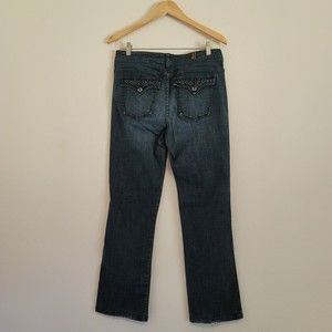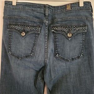 Bootcut Leg. Mid rise. Zipper fly. Embellished Flap back pockets. Cotton/spandex. Machine wash.