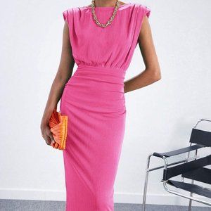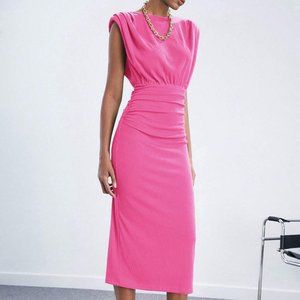 Pink Preppy Womens Solid Shoulder Pad Ruched Waist Dress