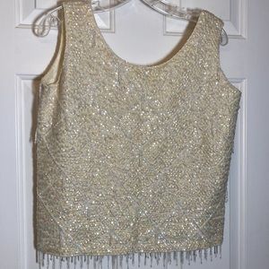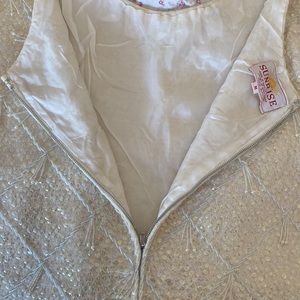 The sequins and beads are iridescent and sparkle and shimmer in the light. Size Medium 100% wool with silk lining. Zipper back. One of a kind!