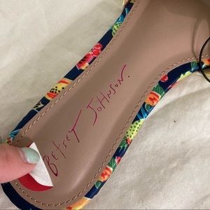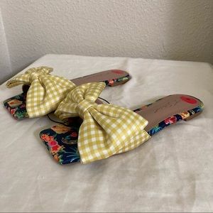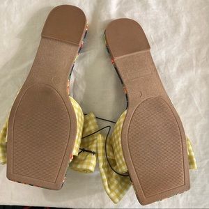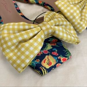 BETSEY JOHNSON bow flats size 6 satin gingham yellow blue tropical fruit pattern