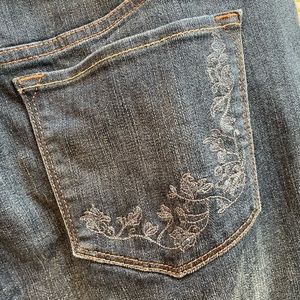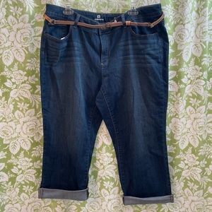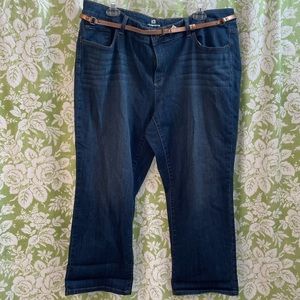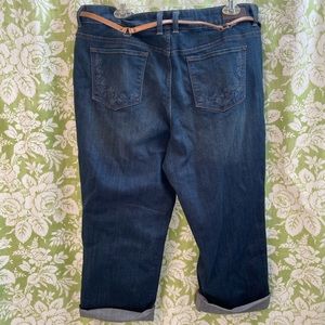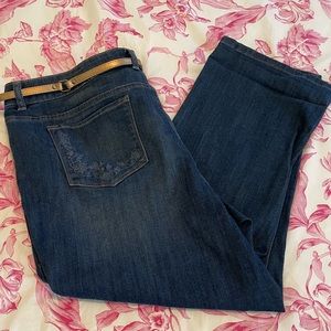Cute cropped jeans from Liz Claiborne. New without tags, slight distressing across front and back. Fun tonal embroidery detail on back pockets, stretchy denim makes these really comfortable. Classic 5 pocket, zip fly style. Cuffs are not sewn so you can adjust them however you like. Belt included. These have not been worn, excellent condition.