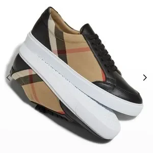 Burberry "Salmond" sneakers in smooth leather paneled with house check canvas. Never worn outside, only tried on a few times indoors. Come with box and shoe bag. Size 10.