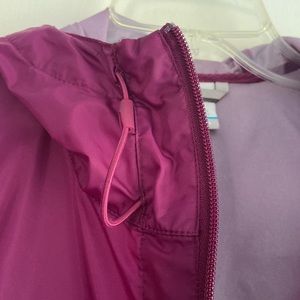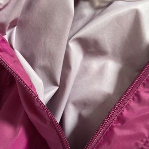 Fuchsia-colored windbreaker featuring adjustable waist and hood, elastic arm cuffs, and zippered pockets. In great condition.