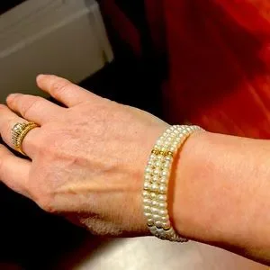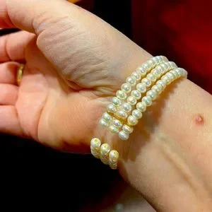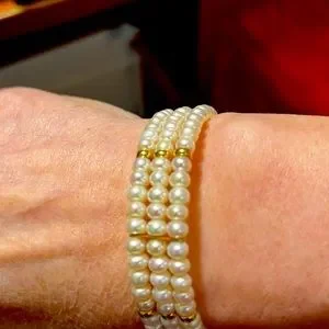 Three Strand 14k Gold Fresh Water Bracelet. Stunning. Wedding Cuff Bracelet. Open collar. Beautiful design,