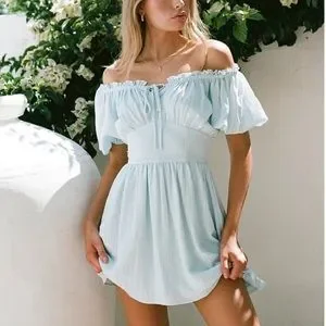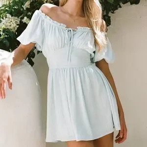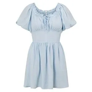 Designed to contour and flatter, the Nyrobi Dress is made from a high quality slightly textured fabric in a soft bue hue. It features bold puff sleeves, gathered bust with a lace up detail, ruffle trim across neckline, fitted corset waist with boning for added support and a flouncy skirt. Styling tip: can be worn on or off shoulder! Designed exclusively by Sabo.