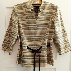 R & K Originals Stand Up Notch Collar 3/4 Sleeve Tie Waist Blazer Black & Tan Stripe Size 12 excellent condition. Seldom worn in great condition. Perfect length unlined blazer with thin shoulder pads and nice detailed grommet front tie black belt and with 3/4 sleeves that you can turn up and cuff. A nice covered 4 button placket to the front gives this blazer a clean and polished look. Pair it with your black pieces! Buy 3 for $20 Bundle